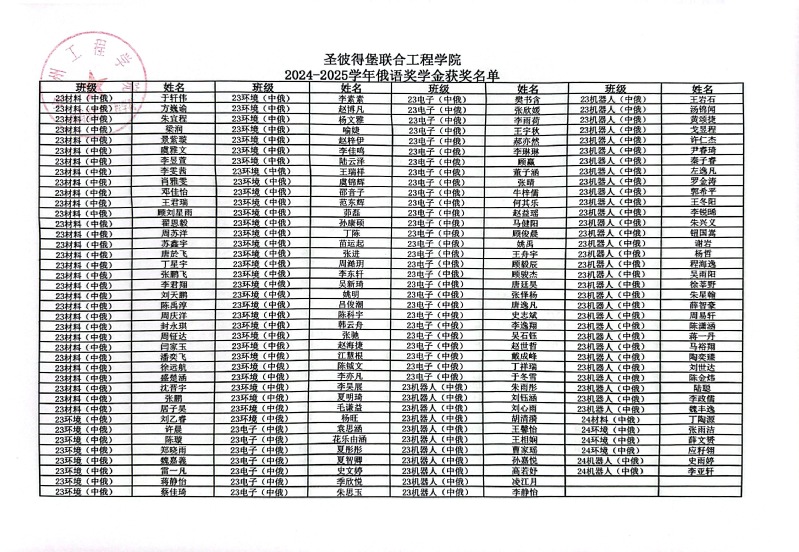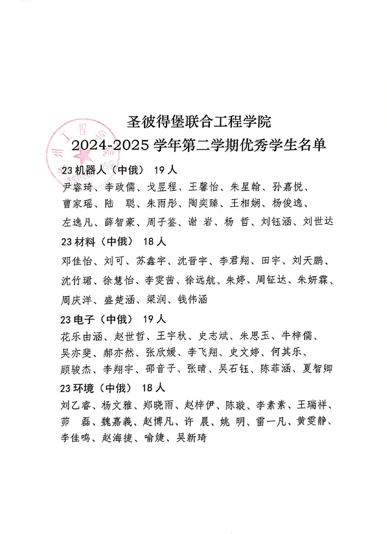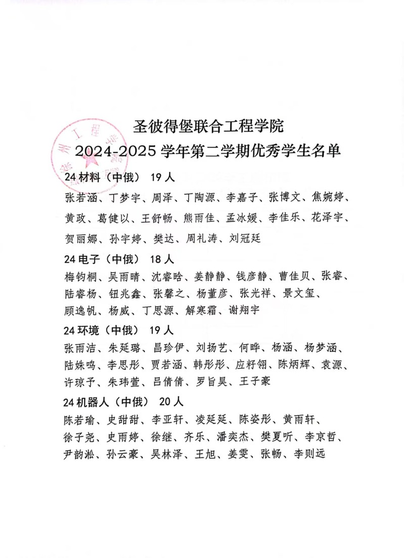 2024-2025学年,圣彼得堡联合工程学院以习近平新时代中国特色社会主义思想为指导,全面落实立德树人根本任务,坚持国际化办学特色方向,全体学生理想信念坚定,学习勤奋努力,涌现出一批态度端正、成绩优良的优秀学生。