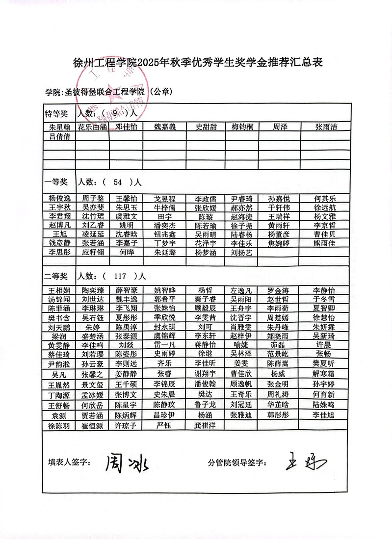 为表彰先进,树立典型,根据学校《徐州工程学院国家奖学金评选办法》、《国家励志奖学金评选办法》和《校内奖学金评选办法》的有关规定,通过班级遴选、学院民主评议、学工处审核、全校公示等评选程序,经学院党政联席会议研究,决定对国家奖学金获得者邵音子、苏鑫宇等8名国家励志奖学金获得者、魏嘉義等9名校内特等奖学金获得者、吴亦斐等54名校内一等奖学金获得者、郭希平等117名校内二等奖学金获得者,共189名优秀学生给予表彰奖励。希望获得奖学金的同学戒骄戒躁,再接再厉,广大学生要以获奖同学为榜样,认真学习,奋发向上,努力使自己成为德智体美劳全面发展的优秀大学生。