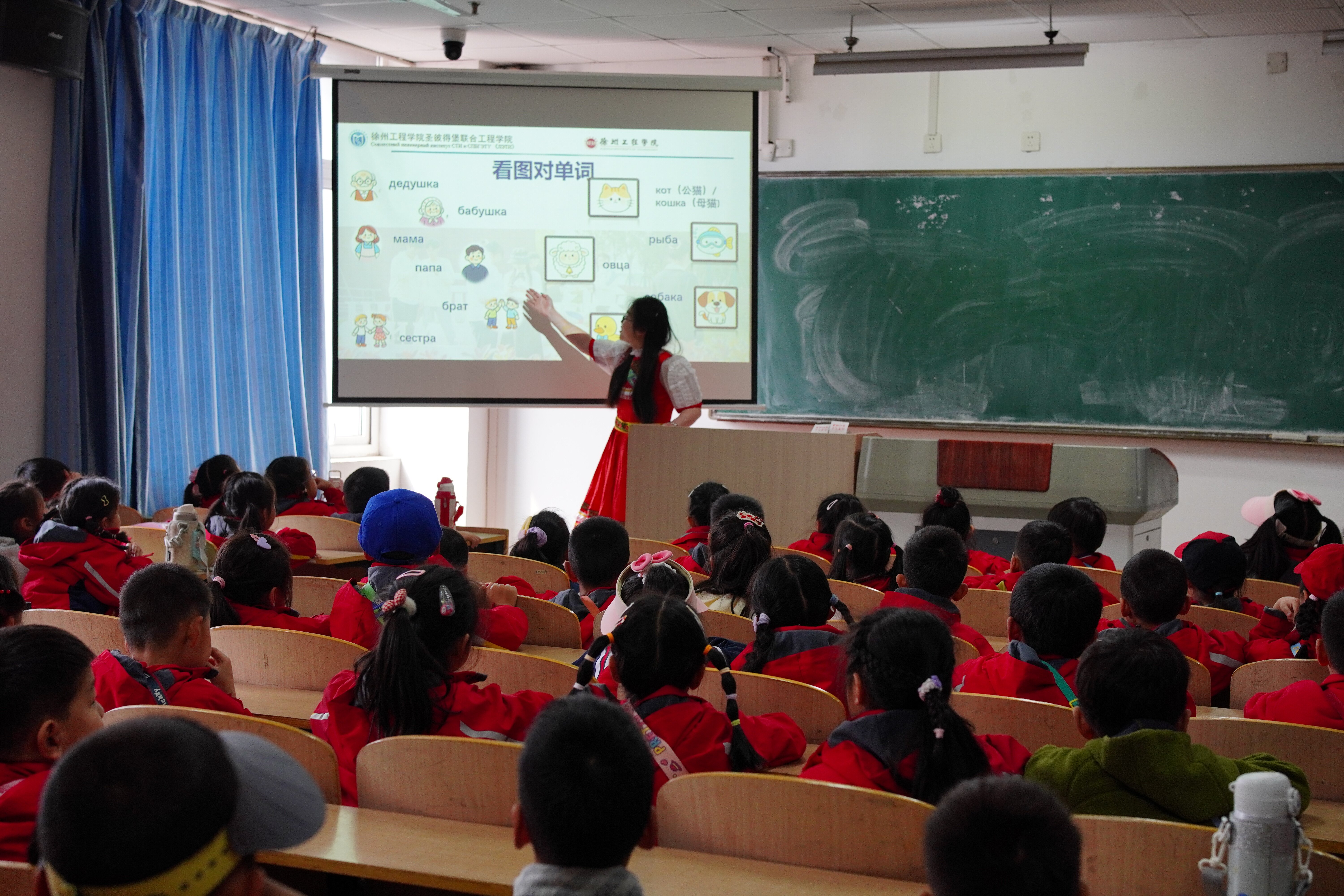 “大手牵小手,欢乐学俄语”环节将活动推向高潮。在敬业楼教室,学院青年夜校团队结合幼儿认知特点,精心设计俄语趣味互动:欢快的俄语儿童歌曲萦绕课堂,孩子们跟着旋律跟唱跟读;图文并茂的俄语单词卡片搭配“看图识音”“你问我答”游戏,引导大家大胆开口,学说“Привет(你好)”“Спасибо(谢谢)”等基础问候语。稚嫩童声模仿俄语发音,现场气氛热烈温馨,寓教于乐的形式有效激发幼儿对俄罗斯语言文化的好奇心,让语言学习成为文化交流的快乐纽带,生动践行“中俄教育年”推动语言互通、人文相亲的核心要义。